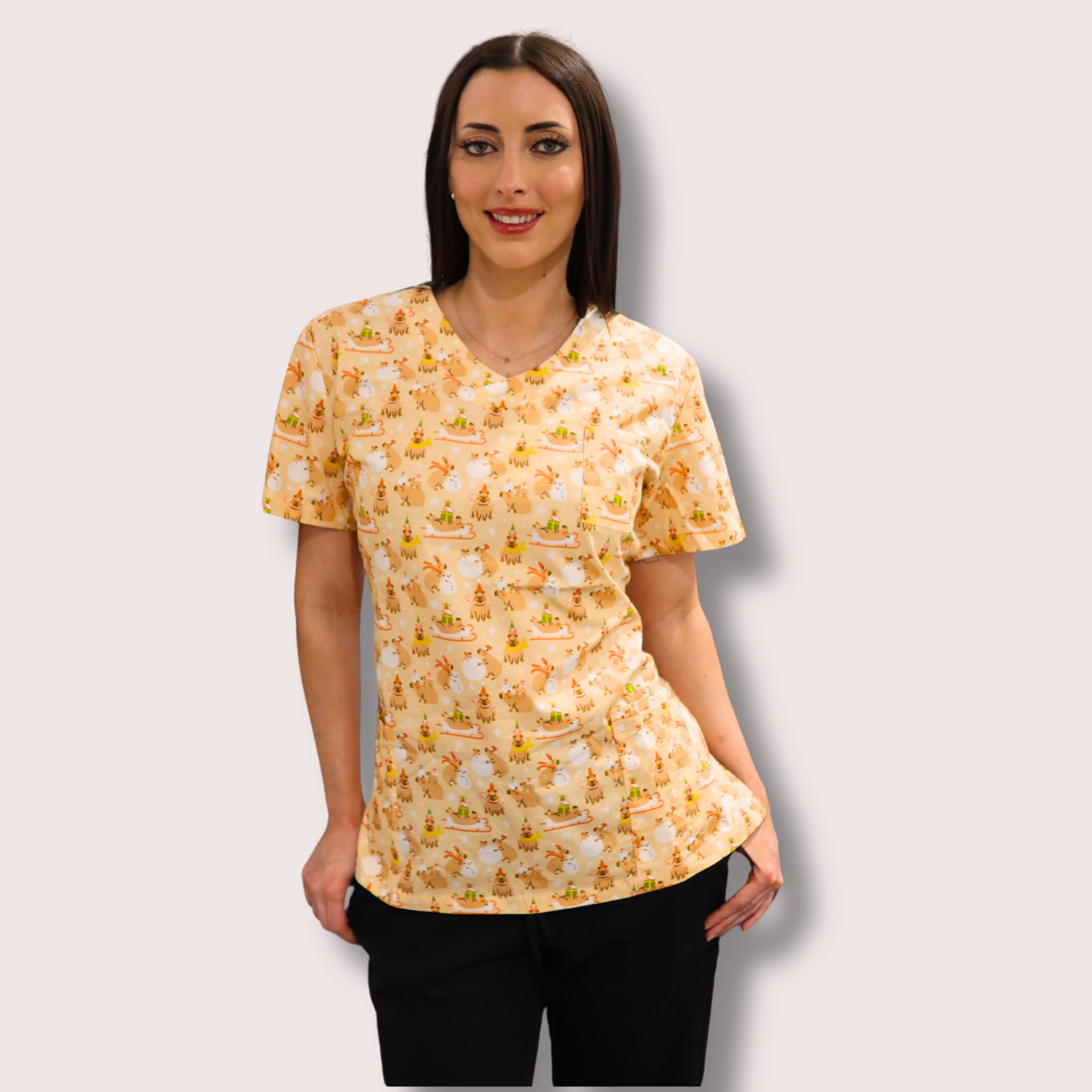 All of our Christmas Scrub Tops are made from 100% high-quality cotton. This makes them lightweight, breathable, and comfortable for long shifts. The fabric is also durable and easy to care for, so your top will stay looking fresh throughout the holiday season.