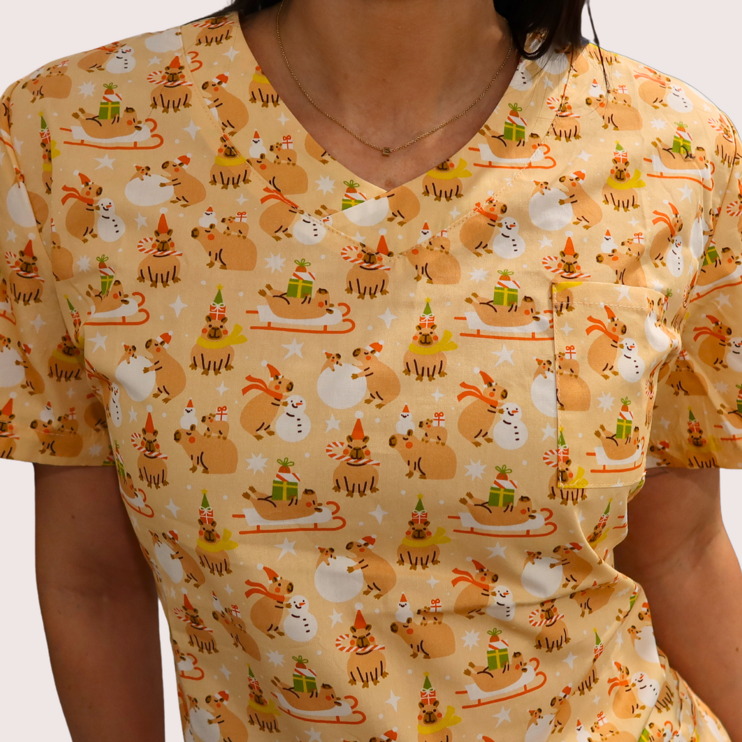 Bring the holiday cheer with the most unexpected star the capybara! Our Capi Christmas Scrub Top features adorable capybaras dressed for the season, making it the perfect choice for anyone who loves a quirky, conversation starting print. Fun, festive, and full of personality.